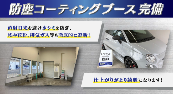 当店は専用の防塵コーティングブースを完備しており、細かい埃や日光を遮断した環境下で作業を実施いたします!